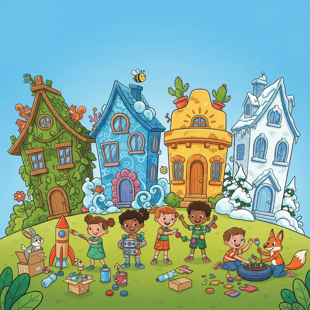 Khám phá Bốn ngôi nhà lớn của thiên nhiên (Đất, Nước, Không khí, Sinh vật) và bài học về môi trường sống, tái chế. Tìm hiểu cách bảo vệ hành tinh xanh qua STEM.
